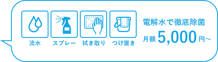水道水と塩を電気分解して作られる水のことです。除菌ができる酸性電解水は脱臭・漂白にも効果があるので、様々な場所での衛生管理に役立てることができて便利ですよ!