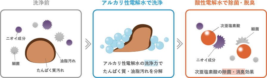 アルカリ性の洗浄力と酸性の除菌力の相乗効果で、