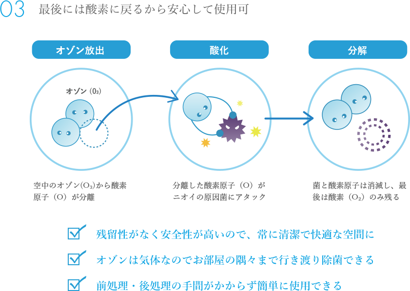 オゾン(O₃)から分離した酸素原子(O)がニオイの原因菌を消滅。香りでごまかさずに、清潔な空気を保ちます。