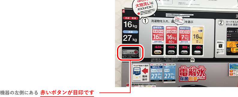 前のお客様が使った後でも気持ちよく使用していただけるよう、無料のドラム内洗浄ボタンを設けております。お洗濯の前に、洗濯槽内に何もないことを確認し、ドアを閉めてから1分以内に「ドラム洗浄ボタン」を押してください。